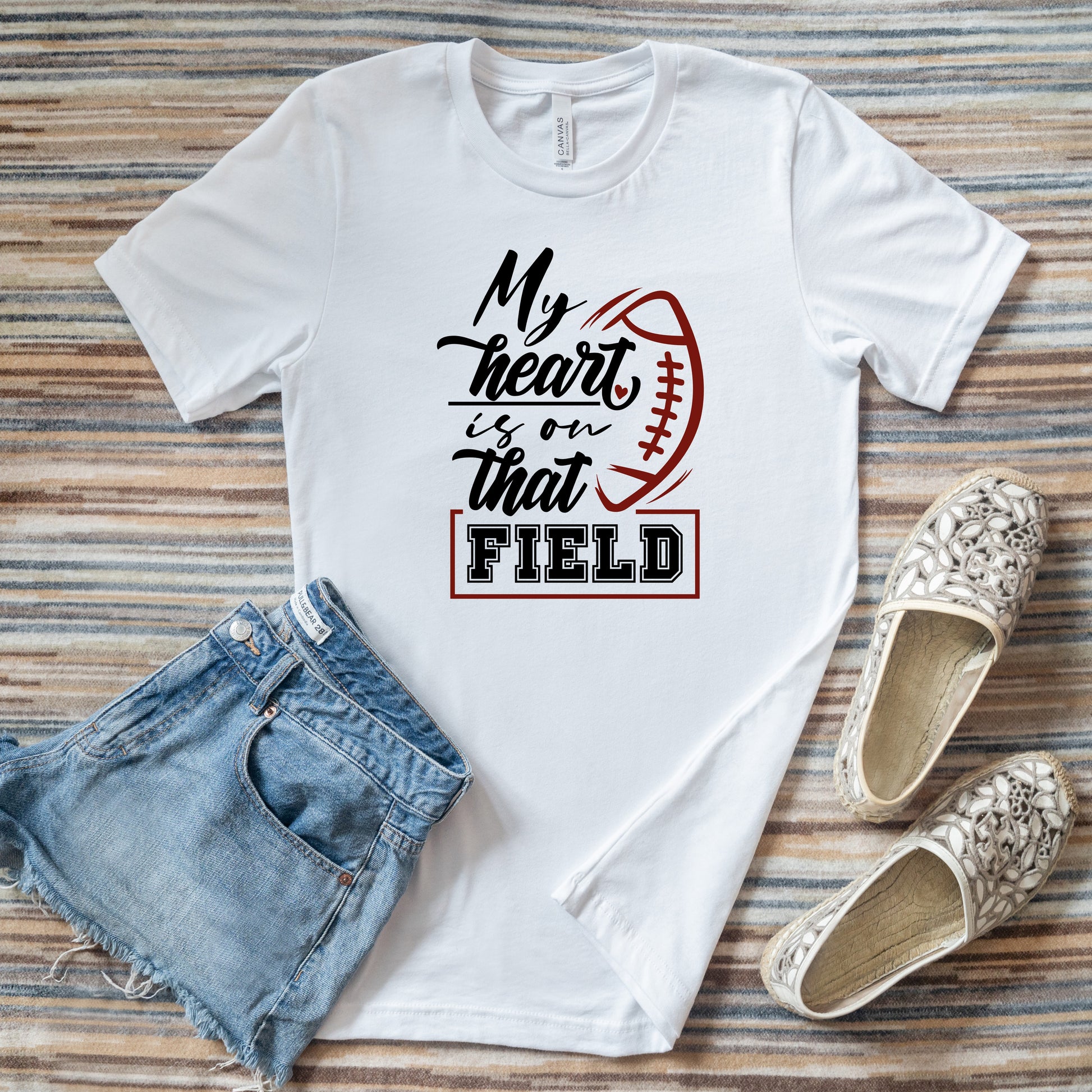 "My Heart is on the Field" is a beautiful top from our Gridiron Collection. Celebrating football with these “Mom” approved designs. Created on 100% Combed and Ring-Spun cotton jersey t-shirt resulting in a soft, comfortable and lightweight shirt. To keep your apparel looking and fitting its best, wash inside-out in cold water with like colors using a mild detergent. Hang or lay items flat to dry to avoid shrinking.